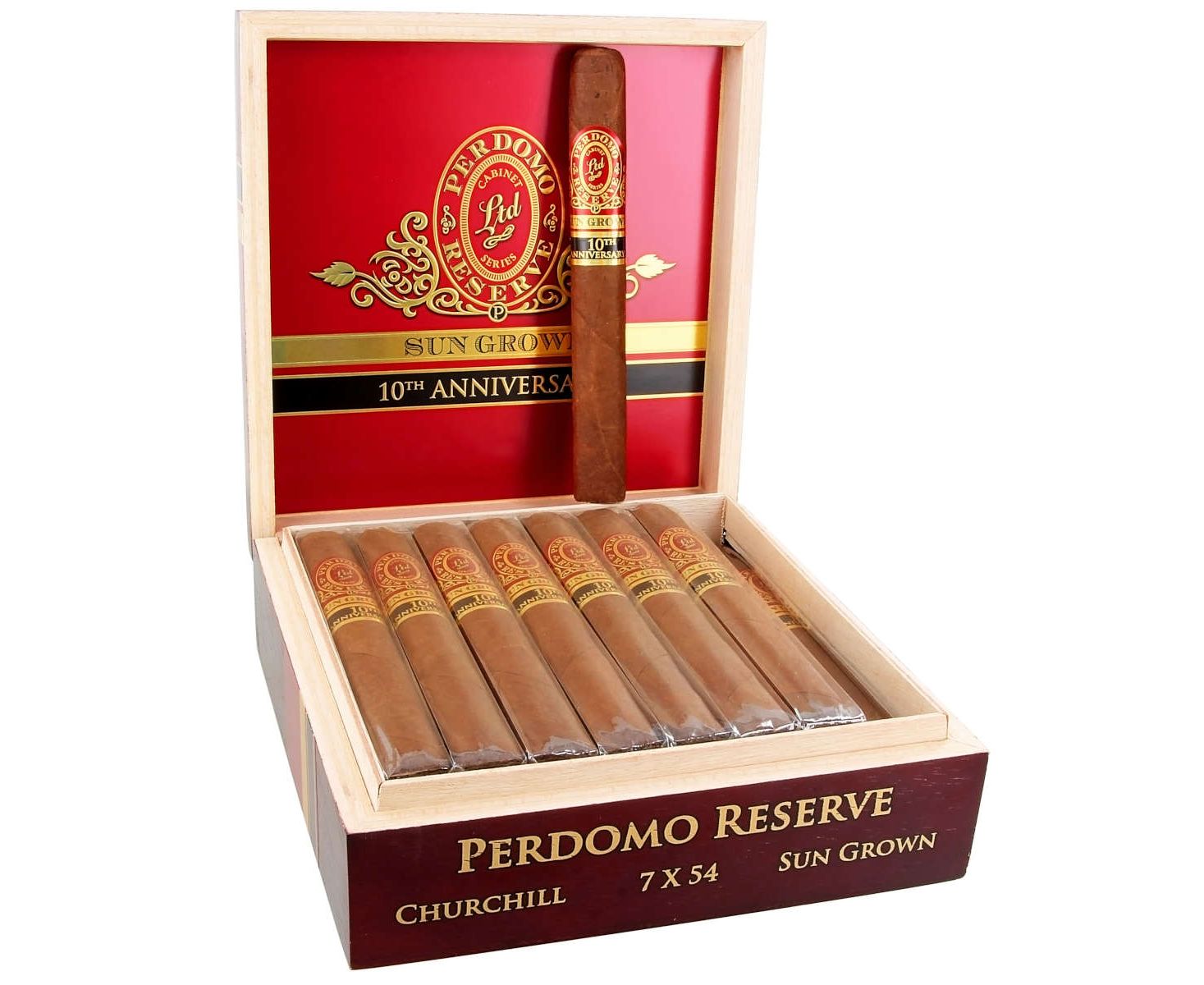 The Perdomo Reserve 10th Anniversary Box-Pressed Sun Grown is a medium to full-bodied Nicaraguan ñpuroî blended with a beautiful 6-year old Cuban-seed Nicaraguan wrapper that has been bourbon barrel- aged for an additional 10 months and is paired with 6-year old Cuban-seed Nicaraguan binder and filler tobaccos to create a rich core of earthy flavors with hints of spice and sweetness on the finish.